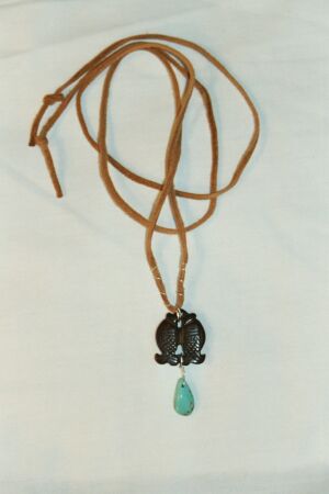 Jade, fish and turquoise on suede using sterling silver wire. |