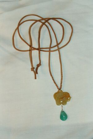 Jade, elephant and turquoise on suede, using sterling silver wire. |